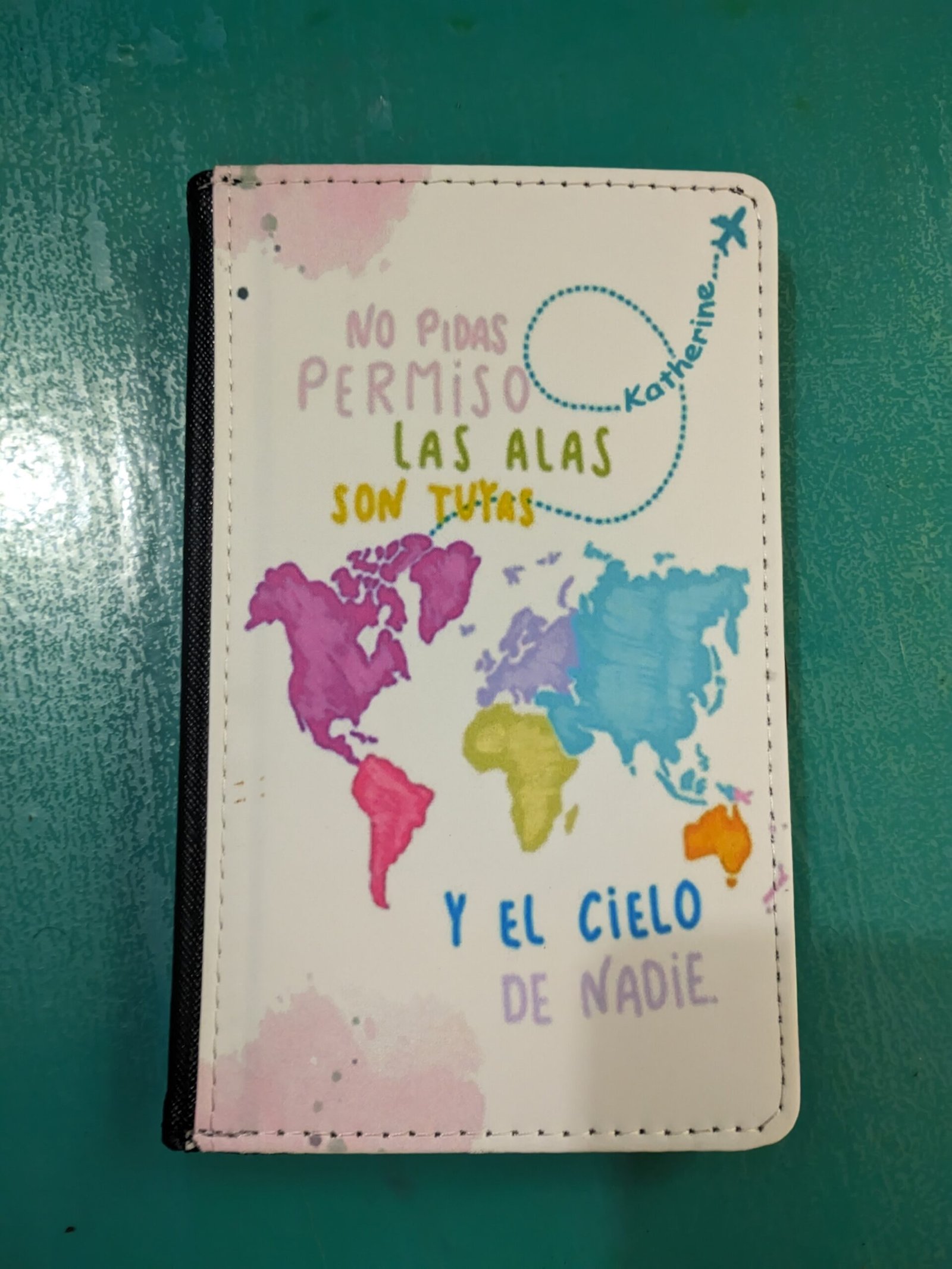 «Viaja con inspiración y estilo. Nuestra funda para pasaporte ‘Alas de Viajero’ combina un vibrante diseño de mapamundi en acuarela con una frase motivadora que te recordará que el cielo es el límite. Personalizable con tu nombre, es el accesorio esencial para proteger tus documentos mientras recorres el mundo.»